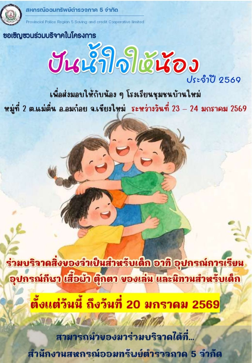 สหกรณ์ฯ จึงขอเชิญชวนสมาชิกร่วมบริจาคสิ่งของจำเป็นสำหรับเด็ก อาทิ อุปกรณ์การเรียน การสอน อุปกรณ์กีฬา เสื้อผ้า ตุ๊กตา ของเล่น และนิทานสำหรับเด็ก  ตั้งแต่วันนี้ จนถึงวันที่ 20 มกราคม 2569  สามารถนำของมาร่วมบริจาคได้ที่...สำนักงานสหกรณ์ออมทรัพย์ตำรวจภาค 5 จำกัด ชั้น 1 ติดต่อสอบถามเพิ่มเติมได้ที่ 093-2299245, 098-5239777 (ฝ่ายธุรการ)