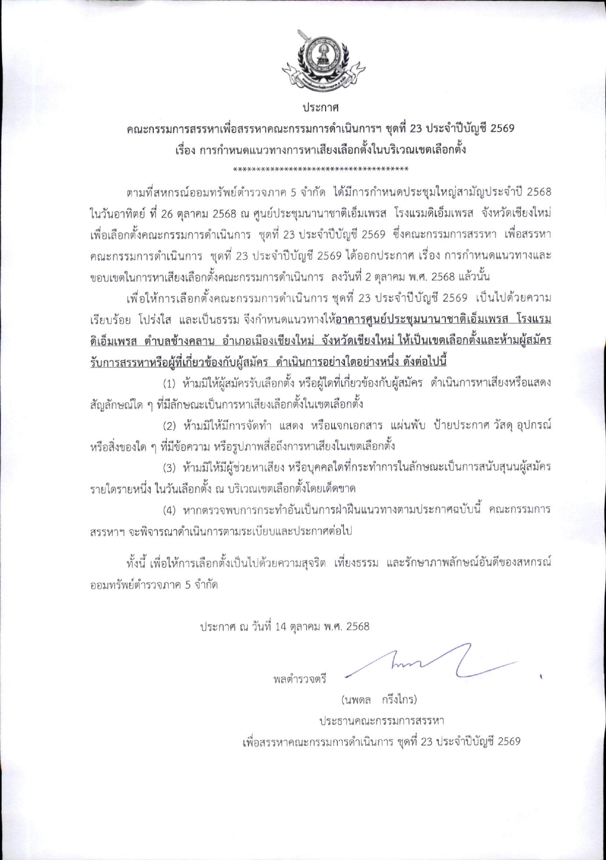 ประกาศ การกำหนดแนวทางและขอบเขตในการหาเสียงเลือกตั้ง คณะกรรมการดำเนินการ ชุดที่ 23 ประจำปี 2569